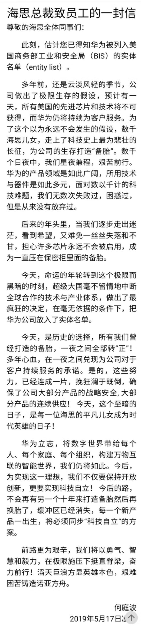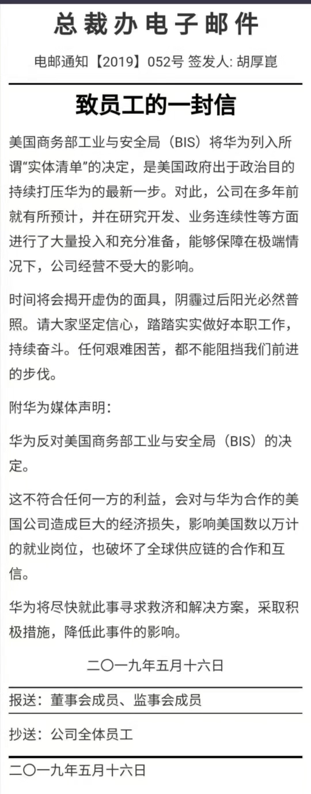 在華為被列入美國商務(wù)部工業(yè)和安全局(BIS) 的實(shí)體名單(entity list)后,華為總裁辦和華為海思總裁分別發(fā)表了致員工的一封信。